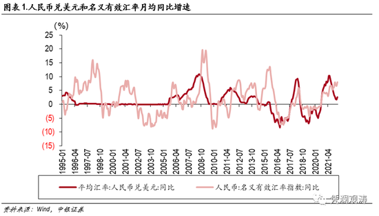 2015年“811”汇改是人民币汇率波动的分水岭。在此之前,人民币对美元单边浮动,更为稳定,而名义有效汇率双向浮动;在此之后,两者皆可以双向浮动,人民币兑美元汇率的弹性进一步上升,“变相”降低了人民币有效汇率弹性 。2021年6月以后两者出现较为明显背离,人民币兑美元同比升值放缓,而名义有效汇率仍进一步升值(见图表1)。两者背离长期不可持续,未来或会逐渐收敛。另一方面,根据数据时间长度和国内外学术的普遍做法,本文选择采用人民币名义有效汇率,并非市场更为关注的人民币兑美元双边汇率。这也有助于降低2015年“811”汇改前人民币兑美元单边升值对分析结果的影响。