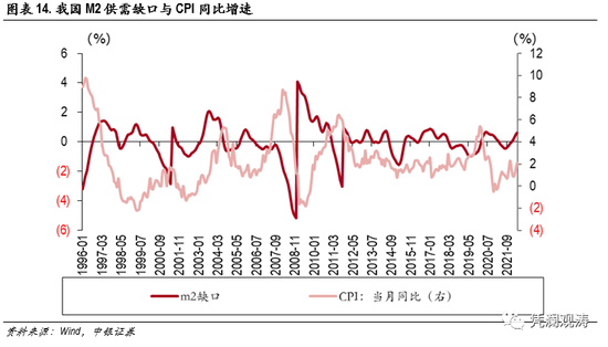我国的M2供需缺口对PPI的领先性较为明显,似乎与PPI受美联储政策主导的感觉略有出入。实际上,我国经济快速成长,稳居全球第二大经济体,货币政策必然会对外产生溢出效应。值得注意的是,PPI依然在2012年后保持较高波动,而我国M2供需缺口则明显缩小。CPI与M2供需缺口的领先性在2012年后变得不再突出。此前,2007年至2008年上半年,我国仍在担忧投资过热会带动通胀压力“爆表”,采取了持续紧缩的货币政策,反而轻视了美国次贷危机的苗头,创下了数据以来的最大货币供需负缺口;此后,我国在2019年猪瘟CPI高增的情况下坚持宽松货币政策,在2020年下半年CPI负增长的情况下坚持货币正常化(见图表13、图表14)。因而,直观上看,我国货币供需可能仍会影响PPI走势,尤其是我国擅长投资驱动的经济模式;CPI则越发与货币供需无关。