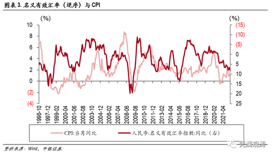 人民币名义有效汇率与物价走势存在较大负相关,即人民币升值、物价走低,但近几年相关性有所下降。由于汇率对物价的影响具有时滞效应,我们以3个月的时滞关系检测不同时期汇率与物价的相关性。PPI方面,2017年10月是转折点,名义有效汇率同比与PPI同比的相关性在此之前为-0.7,之后为0.1。后者较前者不仅在相关性绝对值上明显下降,而且方向也发生扭转(见图表2)。PPI与汇率走势的背离可能受不同时期的两个主要因素影响,一是2017年5月逆周期因子首次被引入使用,主要用来支撑人民币与美元的双边汇率,而非扭转国内去杠杆和全球经济疲软;二是新冠疫情以来供给冲击引发大通胀和强劲贸易形势支撑人民币汇率。