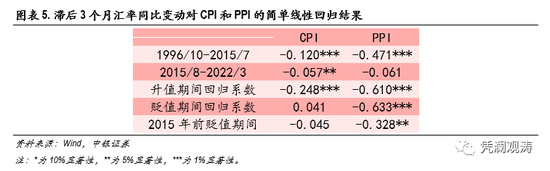 我们将名义有效汇率同比变化率对滞后3个月的CPI和PPI同比增速做简单线性回归。结果显示,与2015年“811”汇改前相比,人民币名义有效汇率对CPI和PPI的影响均有所下降,尤其是对PPI的影响变得不再显著。此外,不管是升值还是贬值,汇率对PPI的影响均较为显著,当汇率同比升值(贬值)1个百分点时,降低(提高)PPI同比约0.61(0.63)个百分点,汇改前和汇改后的模型拟合度分别为0.28和0.17。CPI规律则比较有趣,在汇率升值的样本里系数为-0.25,即升值1个百分点会降低CPI约0.25个百分点,拟合度为0.21;在贬值的样本里系数为0.04且不显著,拟合度不足0.01,表明名义有效汇率贬值对提高CPI的作用不大,参数方向也与理论相悖。进一步使用2015年以前的贬值时期数据,虽然参数系数为-0.04,存在较小的提升作用,但是显著性和拟合值并没有较大改善(见图表5)。