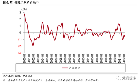 2022年,市场一直存在一个争议,即输入型通胀和国内经济下行对抗时,到底是前者通胀压力大,还是后者通缩压力大。一般情况下,经济下行期间,居民收入下降,储蓄倾向上升,从而消费支出也会有所减少。根据市场和学术界的普遍方法,我们对季调后的工业增加值做HP滤波处理计算产出缺口,并以此代表国内经济预期【1】。从产出缺口走势上看,最近两次负缺口底部分别发生在2019年二季度中美贸易摩擦和2021年四季度国内稳增长政策发力开启(见图表12)。值得注意的是,自去年10月触底反弹后,2022年3月份再次下滑,与国内疫情散发时间一致。同时,2021年6月开始的产出负缺口与国内经济快速下滑时间也一致。毫无疑问,当前我国经济处于收缩区间,与其他主要经济指标表现“弱势”相符。如果输入型通胀会显著影响国内CPI走势,则汇率贬值无疑会雪上加霜,尤其是考虑到国内货币政策宽松预期强烈。