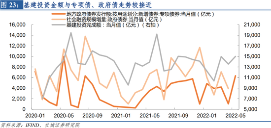 全年来看,专项债超前发力、水利投资、铁路建设等有效投资增加,基建投资可能维持较高水平。财政部在5月30日全国财政支持稳住经济大盘工作视频会议明确要求加快新增专项债发行进度,6月底前要完成大部分今年新增专项债的发行工作,8月份基本使用到位,支持范围扩大到新型基础设施等。按6月底前完成全年额度的80%计算,6月份新增专项债可达8800亿元以上。专项债超前发力有望将带动今年基建投资增速保持较快增长。5月23日国常会在提出促进有效投资时提出,要新开工一批水利特别是大型引水灌溉、交通、老旧小区改造、地下综合管廊等项目、要支持发行3000亿元铁路建设债券。前4月我国完成水利建设投资近2000亿元,同比增45.5%,支撑基建投资维持较高水平。今年水利部设定的水利建设目标,是新开工重大水利工程30项,完成水利建设投资8000亿元。我们结合社融口径政府债同比,预计今年二、三季度基建投资累计同比分别为8.2%、6.9%,今年全年基建投资累计同比增速可能约为6.2%左右。