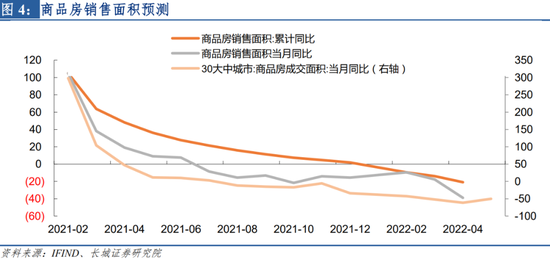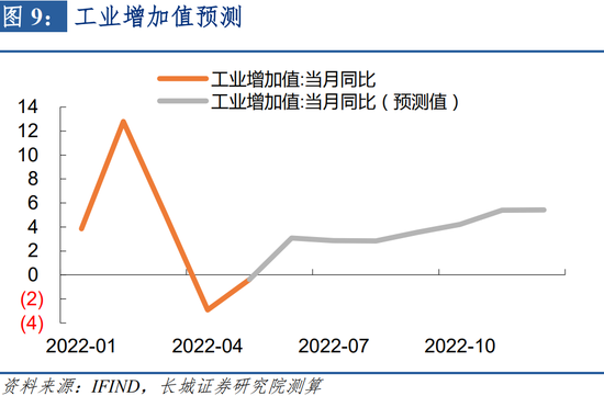 从高频数据中我们可以初步预计5月份工业生产情况,但从全年角度出发,我们可以参考与工业增加值相关的领先指标。根据对历史数据的观察分析,我们发现商品房销售面积同比领先发电量同比大约4个月,而发电量又是反应工业增加值的一面“镜子”。因此我们将商品房销售面积作为工增同比的一个大致的“锚”进行预测,工业增加值同比的低点大致应当在三季度末出现。但我们可以看到,今年四、五月份工业增加值在疫情的冲击下,可能出现类似2020年二、三月份的异常低点,六月份以后工业生产可能将会在复工复产顺利进行下,迎来较大幅度修复性回弹,三季度末可能进一步在房地产销售回暖的带动下继续上扬。我们预测今年二、三、四季度工业增加值当季同比分别为0.1%、3.1%、5.0%,全年工增累计同比可能修复至3.7%左右。