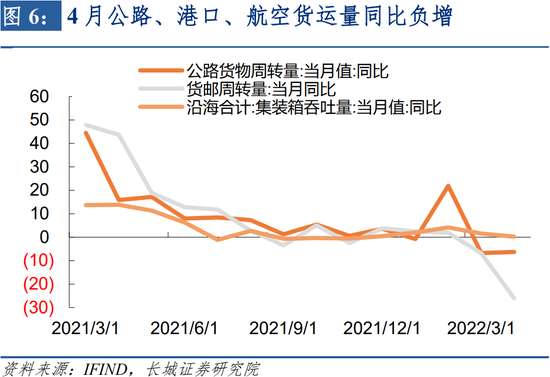 4月份工业增加值同比增速为-2.9%,比3月份回落7.9个百分点。4月疫情防控升级,多地进入“静默期”,华东地区多家企业开工受阻;国内物流堵点增加,供应链压力抬升,工业生产受冲击。4月份发电量同比降低4.3%,较3月份的0.2%大幅下滑。多个重点城市供应链堵点增加,公路货物周转量同比下滑6.25%,与3月份降速持平;港口、航空货物周转量也同比负增。