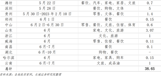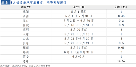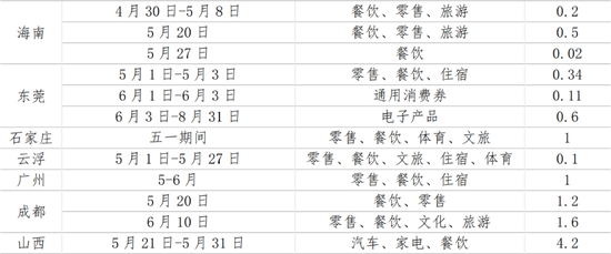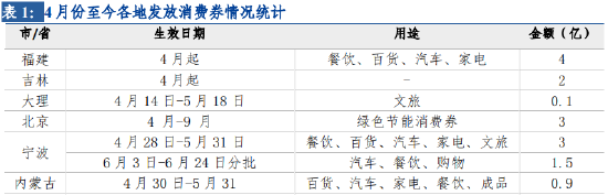 除汽车等大宗消费商品受到补贴,国内多地也已经积极开展其他各类商品的消费券、消费补贴发放活动。据我们统计,4月份各地至今发放的消费券金额总计将近40亿元,重点涵盖餐饮、零售、文旅等疫情冲击较为严重的行业。按照1元消费券能撬动3至5元新增消费来估算,当前的各类消费券有望为5-6月份带来新增消费约150-250亿元。