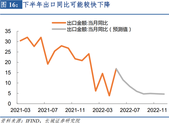 2021年欧美PMI持续高位,外需旺盛,国内疫情率先得以控制恢复生产,国内出口同比持续行驶在两位数的“快车道”上。今年一季度出口同比15.8%延续了去年的出口同比高增,疫情冲击后,5月份重回两位数的同比增速,6月份出口增速可能依然较为强劲。但远月来看,一方面今年美联储加息周期仍未结束,全球流动性继续收紧,外需回落的趋势逐渐形成,出口动能减弱,下半年出口增速可能较快下滑;另一方面我国货币政策与美国相向而行,人民币币值有一定的下行压力,对出口有一定的提振效果。两方面相结合,我们预测今年二、三、四季度出口当季同比分别为10.8%、6.3%、4.8%,今年出口总额全年同比增速可能约为8.9%左右。
