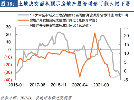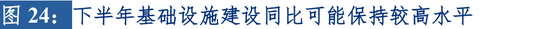 全年看房地产投资,按照销售-拿地-投资的逻辑,可以参考的领先指标是商品房销售面积和土地成交面积。观察历史数据,以上两个指标大约领先房地产投资大约6个月。商品房销售面积5月份或已在筑底,但土地成交面积下滑态势暂未止住,预示着下半年房地产开发投资降速可能依然有加速趋势。若一、二线城市继续加大放松政策力度,房地产销售有效提升,可能传导至房地产投资端。我们预测二、三、四季度房地产开发投资完成额累计同比分别约为-3.5%、-3.1%、-2.3%左右。