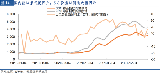 4月份疫情对进出口的影响全面显现,国内供应链受阻,出口景气度降低叠加部分外贸订单转移,美元计价出口同比增速从前三个月的平均15%水平大幅回落至3.9%。5月份出口同比同比16.9%,回升幅度超预期。一方面5月份稳外贸政策成效显著,外贸企业复工复产较快,集装箱吞吐量等物流数据明显好转,5月份PMI新出口订单指数环比上涨,显示5月份出口景气度回升。另一方面欧美PMI虽有回落趋势但仍在扩张区间,韩国出口也在上升,显示外需仍较强劲。美国通胀背景下,我国出口价格涨幅扩大,也在一定程度上拉动出口总额大幅回升。