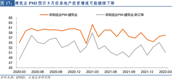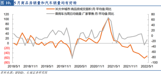 从5月份已更新的高频数据来看,5月份30大中城市商品房销售面积单月同比降幅已经开始缩窄,照此趋势,5月份商品房销售面积累计增速可能将触底回弹。我们认为房地产政策放松力度与广度都仍有空间,尤其是一线二线城市。下半年房地产销售仍可能逐步回升,二、三季度商品房销售面积累计同比增速可能分别为-13.2%、-5.4%,年底有望回升至-2%左右。我们在《20220330二季度宏观报告》中预计全年房地产销售面积同比可能在0%左右,但一方面各地房地产放松力度、降息程度低于我们预期;另一方面疫情影响商品房成交,因此我们下调了对下半年房地产销售的预期。