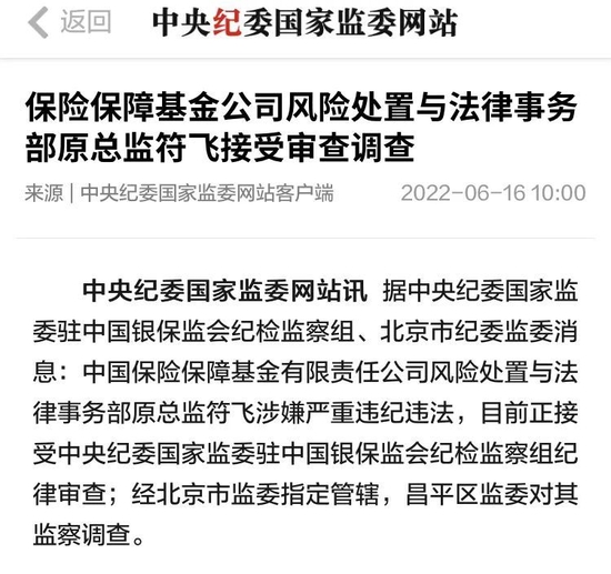 6月16日,CCDI中国保险保障基金有限责任公司(下称“保险保障基金公司”)风险处置与法律事务部原总监符飞涉嫌严重违纪违法,目前正接受纪律审查和监察调查。