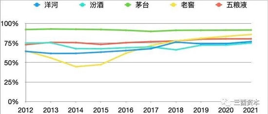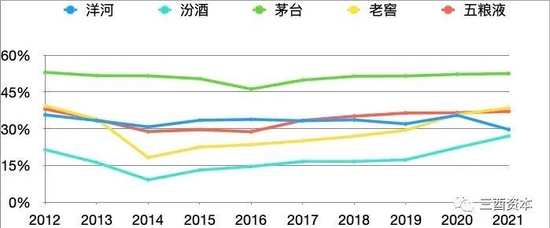 (2012-2021年茅五泸洋汾毛利率走势图,制图:三酉资本)