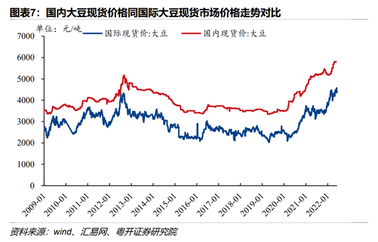 从国际国内价格走势对比来看,国内大米、小麦价格波动率大幅低于国际。对于大米、小麦口粮品种而言,国内粮价同国际粮价的相关性较低。在国际粮价大幅上涨或下跌时期,国内大米、小麦价格走势都相对平稳。而对于玉米、大豆非口粮品种而言,国内粮价同国际粮价相关性较高。在国际粮价大幅上涨时期,国内玉米、大豆价格都出现了趋势性大涨的行情。