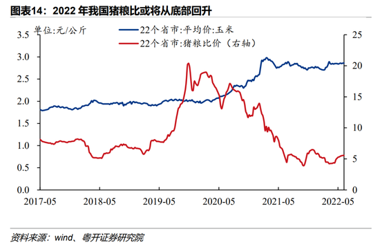 二是种粮成本上涨还会向下游养殖业传导,加大生猪养殖业波动。生猪产业链上游是玉米、大豆等饲料粮种植业。玉米、豆粕是生猪饲料的最主要的组成部分,玉米、豆粕价格上升,带动猪粮比下行,生猪养殖利润收窄甚至亏损,叠加猪周期存栏持续去化,或导致生猪供应大幅减少,加大养猪行业和生猪市场波动。今年4月以来,国内猪价出现回升,受到了饲料用粮价格上涨的拉动。下半年我国猪粮比将从底部回升,或将开启新一轮上涨周期。