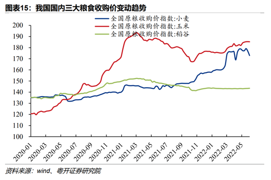 3、国内粮价波动率低于国际粮价。一是收储政策能够降低粮价波动。我国自2004年开始建立稻谷、小麦最低价收购制度,在国际粮食市场发生重大变化时,能够保证粮食供应,稳定市场预期。二是高库存对粮价稳定起到压舱石作用。政府收储积累了大量库存,2021年末小麦、稻谷、玉米的库存消费比分别为103%、76%、48%,均远远高于17%的国际警戒水平。