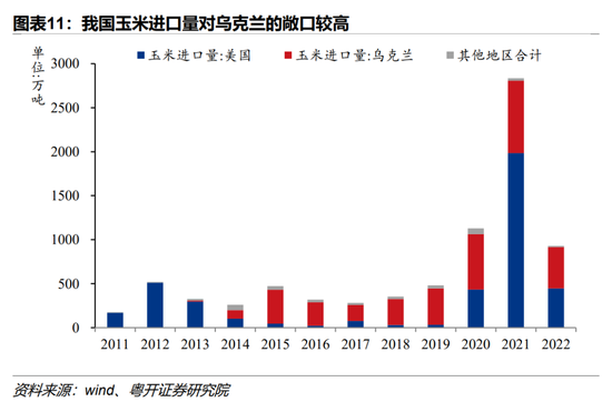 二是受到地缘冲突和粮食贸易影响的品种,如玉米以及油料进口受冲击大。今年受到俄乌冲突影响,乌克兰粮食生产和出口下滑压力较大,使得国际粮食贸易格局紧张。我国玉米的进口对乌克兰依赖度高。2022年1-4月我国玉米进口量约50%来自于乌克兰,如果今年进口量下滑将加剧国内玉米供需不平衡。