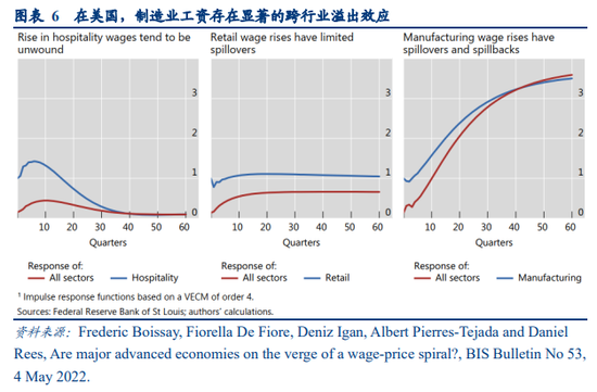 在美国,过去的经验表明,近期某些特定行业的工资大幅上涨不太可能蔓延到其他行业。从历史上看,休闲和酒店行业的工资增长是短暂的,对其他行业工资的溢出效应有限。零售贸易行业的工资对其他部门的溢出效应更持久,但仍然很小;最近制造业工资的增长可能会带来更大的风险,因为该部门的工资增长在历史上有很大的溢出效应。