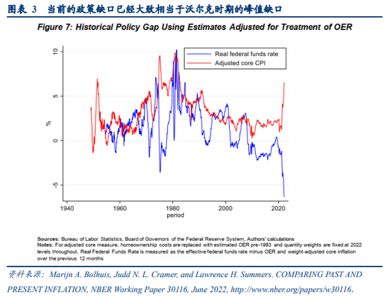 当前的政策缺口(以核心通胀率与实际联邦基金利率之差衡量)已经大致相当于沃尔克时期的峰值缺口。Blanchard (2022)强调了1975-1983年通胀周期与当前通胀周期之间的相似性:在两次通胀上升期间,实际联邦基金利率(名义联邦基金利率减去年度核心CPI通胀率)已大幅降至零以下;在这两个时期,“政策缺口”(以核心通胀率与实际联邦基金利率之差衡量)均大幅扩大。作者的估计数据则表明,当前的政策缺口已经大致相当于沃尔克时期的峰值缺口,2022年3月的缺口是12.7个百分点,用OER调整后的CPI数据估算,政策缺口在1975年4月达到峰值,为12.1个百分点。这一结果表明,Blanchard (2022)的分析仍过于保守。