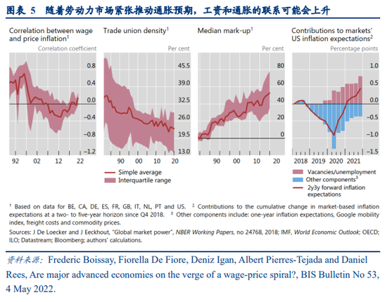 3)但企业的定价权(价格相对于成本的加成)已经上升到历史高位,可能会增加出现工资-价格螺旋的可能性。在大流行前,更高的成本加成降低了工资-价格的传递。但在高通胀环境下,更高的成本加成可能会加剧通胀,因为企业更关注总价格上涨并将其纳入定价决策,这可能是近期通胀压力扩散到那些没有直接遭遇供给瓶颈的行业的原因之一。