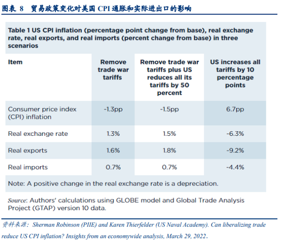 我们选取一篇今年3月美国PIIE发布的报告,这也是近期支持关税能够降低通胀时引用较多的一篇报告。该报告认为,1)如果中美两国取消关税、美国取消对所有国家的钢铝和加拿大软木木材的关税,美国的CPI通胀将较基础水平下降1.3个百分点。2)价格变化将是一次性事件,取消关税只会在取消的那一年降低价格。3)尽管取消关税不会解决与持续或加速过剩需求相关的宏观经济问题,但它可能会对价格造成暂时的下行冲击,这可能有助于抑制通胀预期。