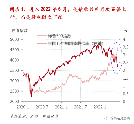 美国股市在最近两周显著下跌。在2022年6月8日到6月17日间,标普500指数跌幅超过10%。同期,欧洲股市也同步下挫。由于在6月美股急跌的同时,美国国债收益率显著上扬,且近期发布的美国5月份通胀数据也高于之前预期,所以不少投资者认为美股因高通胀而下跌。(图表 1)