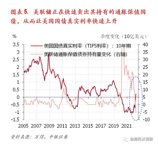 而带动美国国债真实利率上升的是美联储的“缩表”。从2017年以来,美联储对通胀保值国债的买卖量就与通胀保值国债利率明显负相关——美联储是近年来通胀保值国债收益率变化的主导力量。今年6月,美联储已经开启了“缩表”进程(开始减少其资产规模),开始卖出其持有包括通胀保值国债在内的美国国债。美联储的抛售推升了美国国债真实利率,进而给美国股市带来了巨大压力。可以说,近期将美股吓倒的是美联储的缩表。(图表 5)