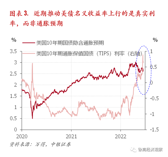 数据也支持股票是通胀保值资产的结论。从长期来看,美股涨幅与通胀预期正相关。美国政府发行普通国债和通胀保值国债(TIPS)两种债券。前者的收益率是名义利率,后者则是扣除了通胀影响之后的真实利率。二者之差就是国债利率所隐含的通胀预期。在过去十多年中,通胀预期越高,美股涨幅往往越大。在此历史规律之下,很难将当下美股的下跌归咎到通胀上去。(图表 2)