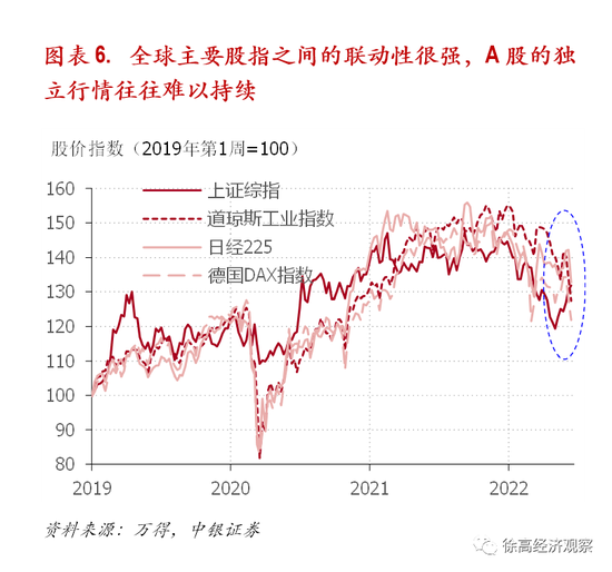 美股的弱势势必会向A股传导。最近几年,全球主要股票指数间的联动性很强,包括A股在内的全球各个股市很难长期走出独立行情。在美联储缩表令美股下挫的时候,A股难免会受波及。今年4月末以来,A股随国内疫情和经济状况的改善而明显反弹,走出了与大部分股市市场相异的行情。但A股的这种反弹恐怕还难以转化为反转。接下来,国内投资者需要把更多注意力放到美国股市,以及美股背后的美联储身上,做好应对美联储“缩表”冲击的准备。(图表 6)