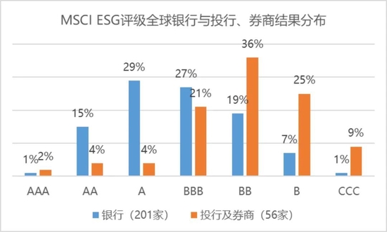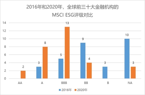 从MSCI(Morgan Stanley Capital International)发布的ESG评级指数,可以发现全球对于ESG的关注明显提升。从全球前三十大金融机构的MSCI的ESG评级来看(见图1上),从2016年至2020年间,多数机构的评级结果都逐年攀升,直到2020年底几乎都介于BB与A之间,此现象说明可持续金融已普遍受到国内外金融机构的重视。分行业来看(见图1下),商业银行表现好于投行及券商,在全球201家银行中领先银行约占16%(即ESG评级AAA为1%,AA为15%),相较而言,56家投行及券商中,领先者占6%(其中AAA为2%,AA为4%)。由此可见,商业银行对于ESG的关注处于金融领域的领先位置。
