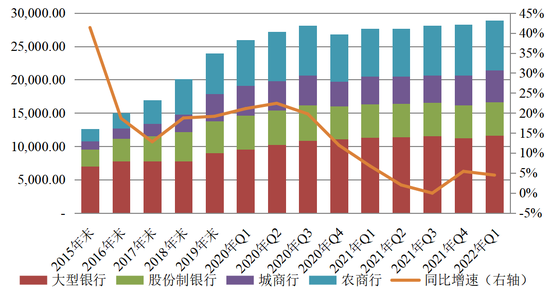 贷款增速较快依然是资产增速变化的主要原因。央行数据显示,2022年一季度新增人民币贷款8.3万亿元,同比多增6636亿元,3月末广义货币(M2)和社会融资规模存量同比分别增长9.7%和10.6%,较上年末分别上升0.7个和0.3个百分点。央行也要求信贷总量保持稳定增长,继续加大对于重点领域和薄弱环节的支持力度。