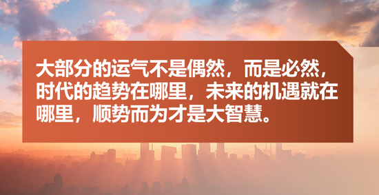 那么,运气究竟是什么?运气不是偶然,而是必然,我们大部分的运气是时代的趋势。时代选择了你,你也选择了时代。