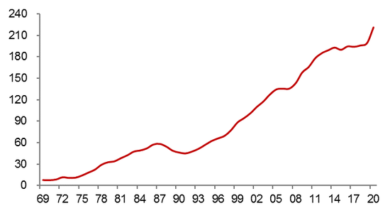 但是,日本政府为了稳增长所付出的代价也是巨大的。目前日本政府(含地方政府)的债务余额占GDP比重为256%,几乎是全球最高的。即便剔除地方政府的债务,2020年中央政府的债务余额占GDP的比重也达到221%,是日本20年前的两倍多。而美国联邦政府的杠杆率为130%左右。