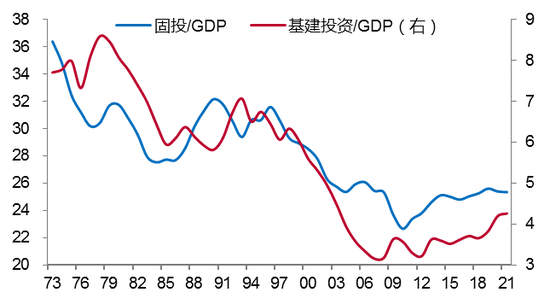 与日本相比,我国无论是固定资产投资还是其中的基建投资,占GDP的比重都很高。说明我国的经济增长模式是一个典型的投资拉动模式。但与日本类似的是,投资都经历了冲高回落的过程,固定资产投资占比在2016年达到80%以后就开始回落,基建投资占比则在2017年以后开始回落。说明经济增长的动能在减弱,中国经济从高增长转向高质量增长。