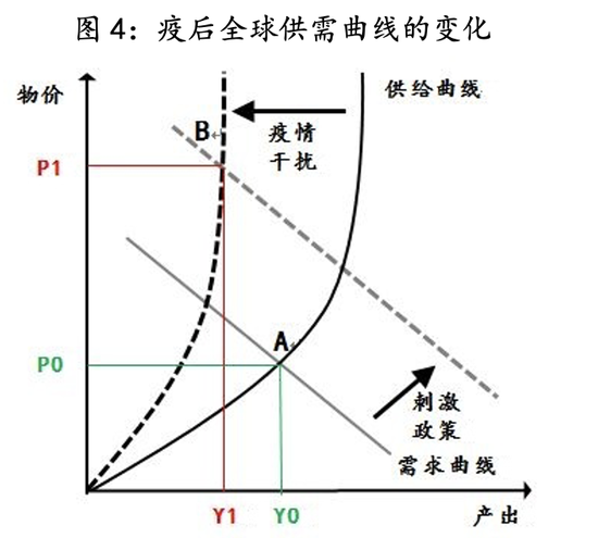 五是,从中长期变量而言,绿色能源对化石能源的替代成本、全球供应与贸易体系重构的成本、全球跨境投资税率的上升、工人阶层谈判能力的增强等将持续抬升供应端的成本,尤其是经过疫情冲击,当前全球供应链已经丧失了应有的弹性,相应价格机制平衡供需功能随之衰减,即价格的上涨并不能撬动供给的快速增加,形成供应短缺的严重通货膨胀局面,即如图4所示,产出由Y0缩减至Y1,价格由P0飙升至P1。