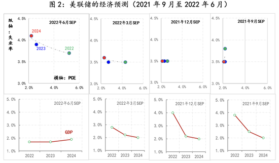 然而,即便美联储如此坚决地将对抗通胀重新列为政策首要任务,但若观察过去一年间美联储对通胀、就业和经济增长预测的变化情况(SEP),实现“软着陆”的难度越来越大。截至6月末,美联储预期2022-2023年的通胀中枢水平分别为5.2%和2.6%,较一年前的预测有了明显抬升,2022-2023年的失业率预测分别为3.7%和3.9%,也较一年前预测有所抬升,对应2022-2023年的GDP则下调了预期增速,若从过去一年间所做的四次预测变化来看,美联储已将美国经济回归正常的时间延后至2024年左右。