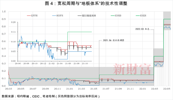 反之,在宽松周期,如果流动性过剩,利率可能突破目标下限。美联储一般会启动逆回购,同时提高ON RRP利率,缩小与IORB的利差(或扩大与目标下限的利差)。例如,新冠疫情之后,美联储重启QE,准备金显著过剩。2021年初开始,货币市场利率持续下行,显著低于IORB。3月,SOFR降至0.01%的低点(图4)。4月底开始,逆回购规模显著增加。6月,美联储进行了一次技术性调整,将IORB和ON RRP利率均上调了5bp,货币市场利率的中枢也随之上调5bp。