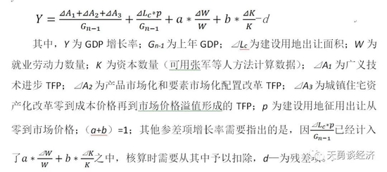 一国产出增长速度决定于劳动力、资本和土地要素投入数量的增长速度和在要素投入量不变的情况下要素产出水平的提高。在国民经济核算中,将这种投入量不变,产出量却因生产率提高而增加的部分,称之为“额外”所得余值或全要素生产率。一般的经济学教科书,认为其来源于教育普及深化、知识进展、人力资本积累、技术进步、新技术装备化和产业化等,因此,也称之为广义技术进步TFP。