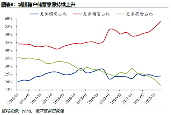 第二,未来不确定性增大,居民预防性储蓄上升,平均消费倾向降低。央行城镇储户问卷调查结果显示,二季度居民收入信心和就业预期指数分别为45.7%和44.5%,较一季度下降4.3和6.0个百分点;相应地,倾向于“更多储蓄”的居民占58.3%,比上季增加3.6个百分点。