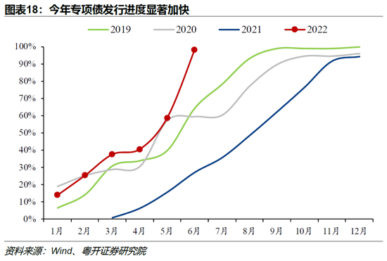 在适度超前开展基建下,2022年发改委审批的固定资产项目明显高于往年,导致今年项目资金需求较高。截至6月底,新增专项债发行规模达到3.4万亿,完成已下达额度的98%,债券资金将在8月底前基本使用完毕,三季度末和四季度基建项目将面临资金断档的情况。从发行背景、发行主体和资金用途上看,新增政策与2015-2017年发行专项建设债较为相似。2015-2017年,约有2万亿元资金重点支持基建投资,带动基建投资维持较高增速。
