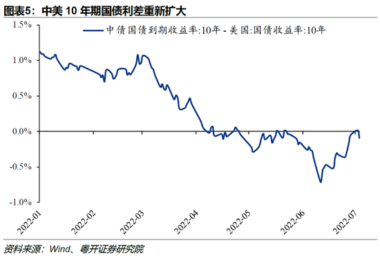 3月国内疫情出现反弹时,中国经济下行压力进一步增大,而美国经济却面临需求旺盛和劳动力市场紧俏进一步推高通胀的过热风险。因此,市场预期中美经济增速将出现倒挂,美国GDP增速或自1977年以来首次超过中国。中美经济和货币政策周期错位,导致中美10年期国债利差持续下滑,一度倒挂72 BP。