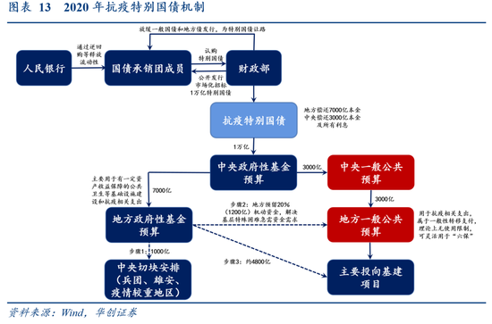 特别国债历史上出现过三次新发,分别为:1998年为缓解金融风险、补充四大行资本金新发2700亿特别国债(图11);2007年为缓解流动性过剩新发1.55万亿特别国债(图12)。2020年为筹集财政资金、统筹推进疫情防控和经济社会发展,发行1万亿抗疫特别国债——不同于1998、2007年特别国债100%对应形成资产,抗疫特别国债中至少4200亿可用于弥补预算缺口(抗疫相关支出),剩余5800亿主要投向基建项目(图13)。