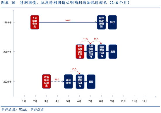 一是从流程看,与不进预算、随时可发的专项建设基金和或能绕过预算调整的专项债提前发行相比,特别国债必须走预算调整流程,欠缺灵活性;二是从效果看,今年稳增长重点在基建,专项建设基金和专项债提前发行“名正言顺”,特别国债欠缺目的性;三是从可行性看,即便7月底明确特别国债发行(图9),按历史耗时推算,发行通知最早也要等到10月中上旬才能发布(图10),留给年内发行的时间窗口较为狭窄,不符合“该出手时就会出手”的增量政策工具初衷。