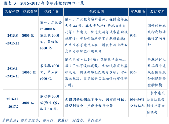 为何不到两年就退出?出现两大现象,使实际撬动存疑。一是挤出社会资本和银行贷款:项目公司以1.2%的极低成本获取项目资本金,远低于市场平均融资成本(甚至低于一年期存款利率),滋生套用空间;二是资金沉淀,审计发现,“部分重大建设项目中存在行政许可手续不完善、项目建设滞后、以老项目代替新项目及基金投放速度慢、闲置和利用率不高等问题突出”。上述现象使原定于16Q3发行的第七批专项建设债拖至10月才重启,并对资金投向和贴息率做出大幅调整(图3);伴随2017年初经济回升,专项建设基金淡出政策视野。