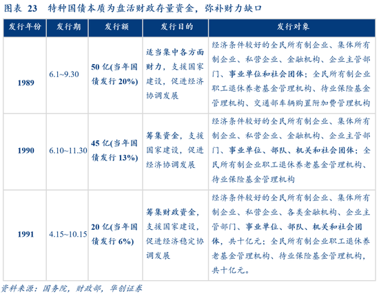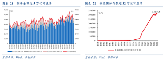 还剩多少可盘?窄口径近5万亿可盘,宽口径近40万亿可盘。窄口径即国库余额(又称财政存款),据财政部副部长许宏才介绍,截至4月末国库余额4.94万亿,对应存央行的政府存款+存商业银行的国库定期存款;宽口径为国库余额+机关团体存款,其中机关团体存款余额已超32万亿,主要是大学、医院等事业单位的沉淀资金;这部分盘活难度相对较大,或需动用类似1989-1991年的特种国债(图23)。