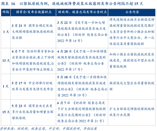 从政策流程看,出台快速灵活。国务院同意后,通常通过国常会、新闻发布会、座谈会等形式先行披露,随后财政部、税务总局及有关部委快速发布公告明确细节、转入执行;以留抵退税为例,4次发布公告时点和政策披露时点间隔不超过15天(图16)。