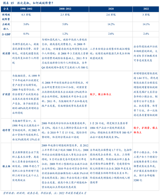 历次应对危机的减税降费,主要有3次可供年内参考(图15):1998~2002年应对亚洲金融危机,主要偏扩投资、稳外贸,同时帮扶国企下岗职工;2008~2012年应对次贷危机,采用较为均衡的结构性减税;2020年应对疫情冲击,大规模减税降费以保主体为主,降费是大头(为市场主体减负超2.6万亿,其中减免社保费1.7万亿)。2022年在疫情反复下稳增长,主要通过留抵退税扩投资、保主体(预计全年新增退税超1.64万亿,减税1万亿,社保缓缴0.32万亿)。