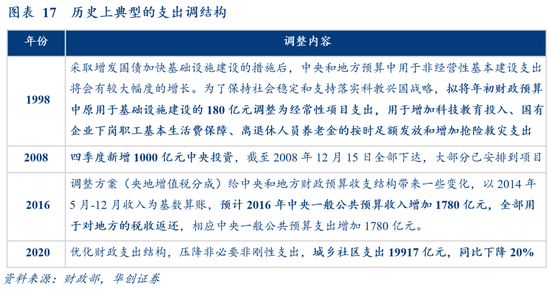 支出工具可分为调结构和保总量两类。前者由于支出较具刚性,除了1998年腾挪基建支出、2008Q4追加中央投资、2016年对应增值税调整增加税收返还、2020年大幅压降基建支出等特例外(图17),和预算安排相差不大。