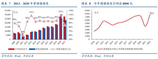国债超发的依据,是我国自2006年起对国债实行余额管理,简单来说就是只要不超规定的年末限额,每年新增发行(对应余额上升)不受限制,中央赤字并非硬约束:立法机关不具体限定中央政府当年国债发行额度,而是通过限定年末国债余额上限来限制国债规模,这一上限每年可向上提升,幅度即为当年全国人代会批准的中央赤字规模,因此,一旦过往年份国债少发(净融资少于当年中央赤字),就会积攒未来超发的空间;由于2009年以来国债除2013、2020年外均为少发,今年已积攒了近8000亿超发空间。