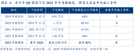 二是盯住8、9月的潜在提前下达。2018~2020年都晚于11月提前下达,主要是当年额度到三季度末才基本发完,考虑到冬季施工条件,提前下达实际都指向下年启动发行;而今年发完时点较往年提前了一个季度,若提前下达时点也随之前移至8、9月(财政部开吹风会或地方财政接受采访披露),提前发行将具备往年未有的施工条件,概率大增。