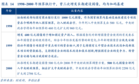国债增发将直接增加赤字,且加码基建效果不如专项建设基金、专项债提前发行,理论上优先级最低,历史上出现过三次:分别为1998、1999、2000年增发1000亿、600亿、500亿(图14)。