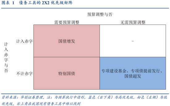 预算执行中,5种工具按是否计入赤字(可持续性)和是否需要预算调整(便利性),可划分为2X2优先级矩阵。其中,专项建设基金、专项债提前发行属于高优先级,特别国债属于低优先级。